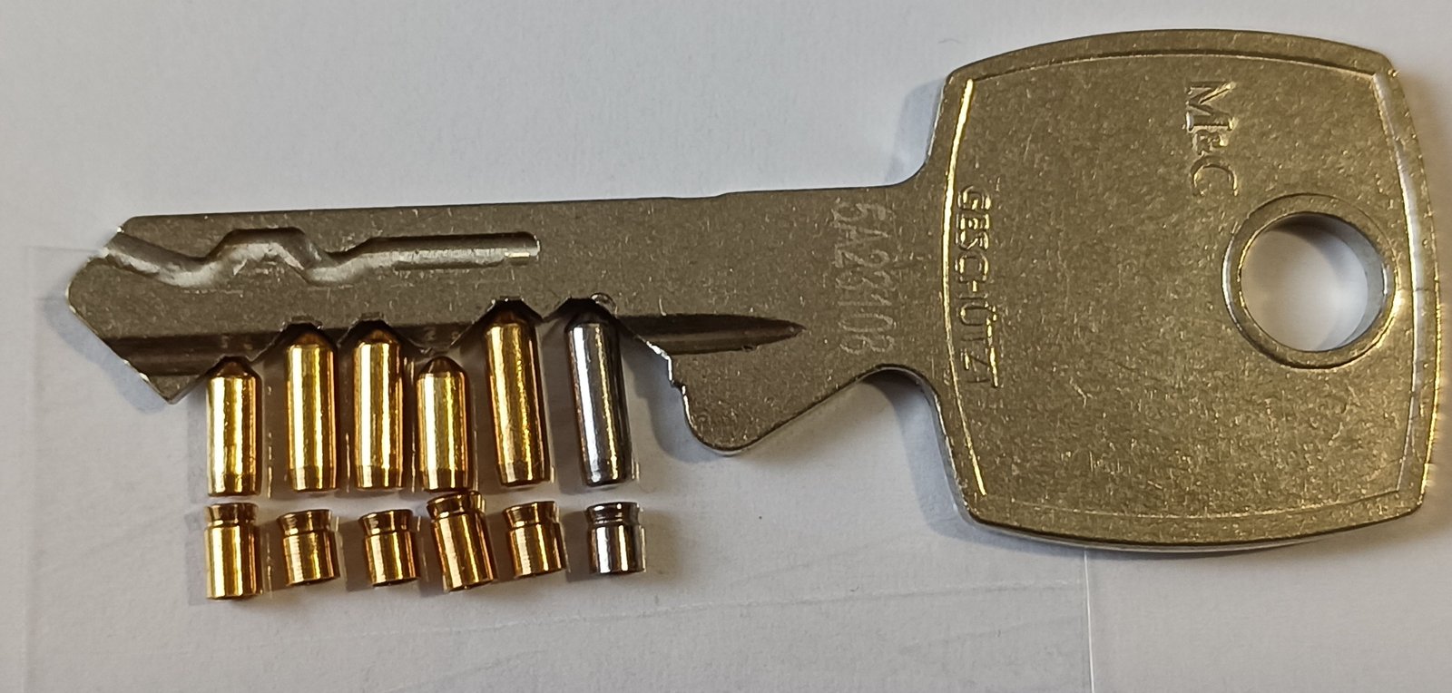 Atkreipkite dėmesį į kontr-pinus. Jie turi sudėtingą formą, kuri apsunkina cilindro atidarymą visrakčio pagalba. Be to, kontr-pinai yra skirtingo aukščio, todėl sudėtinga atidaryti manipuliaciniais metodais.