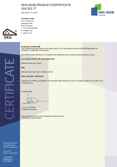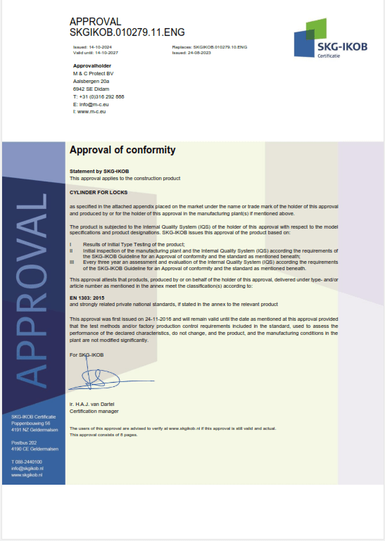 M&C gamina padidinto saugumo cilindrus pagal griežtus Europos standartus. Visi cilindrai sertifikuoti pagal EN-1303, DIN-18252 ir turi SKG sertifikaciją (nuo SKG** iki SKG***, priklausomai nuo modelio).