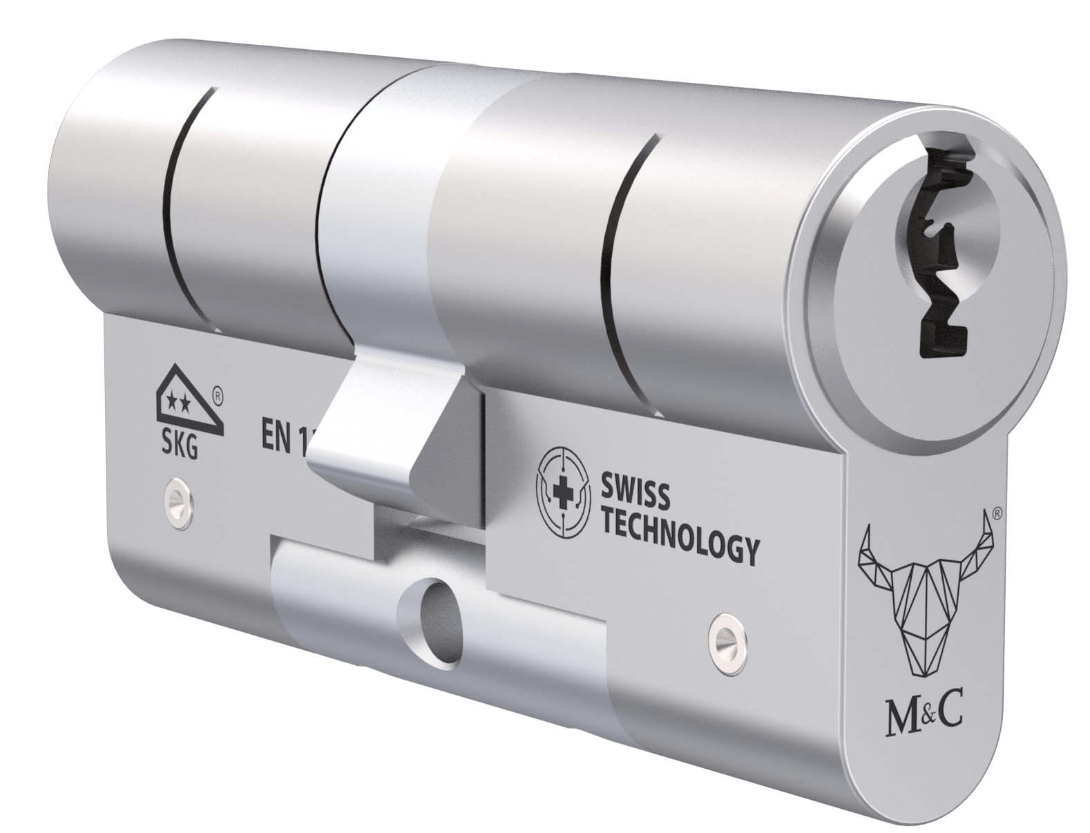 M&C MATRIX** – tai mechaninis europinio profilio cilindras su SKG** sertifikatu, užtikrinantis vidutinį apsaugos lygį nuo intelektualių ir jėgos atakų. Šis modelis yra panašus į M&C MATRIX***, tačiau yra ekonomiškesnis, nes neturi kai kurių papildomų apsaugos sprendimų, būdingų aukštesnio saugumo cilindrams.
