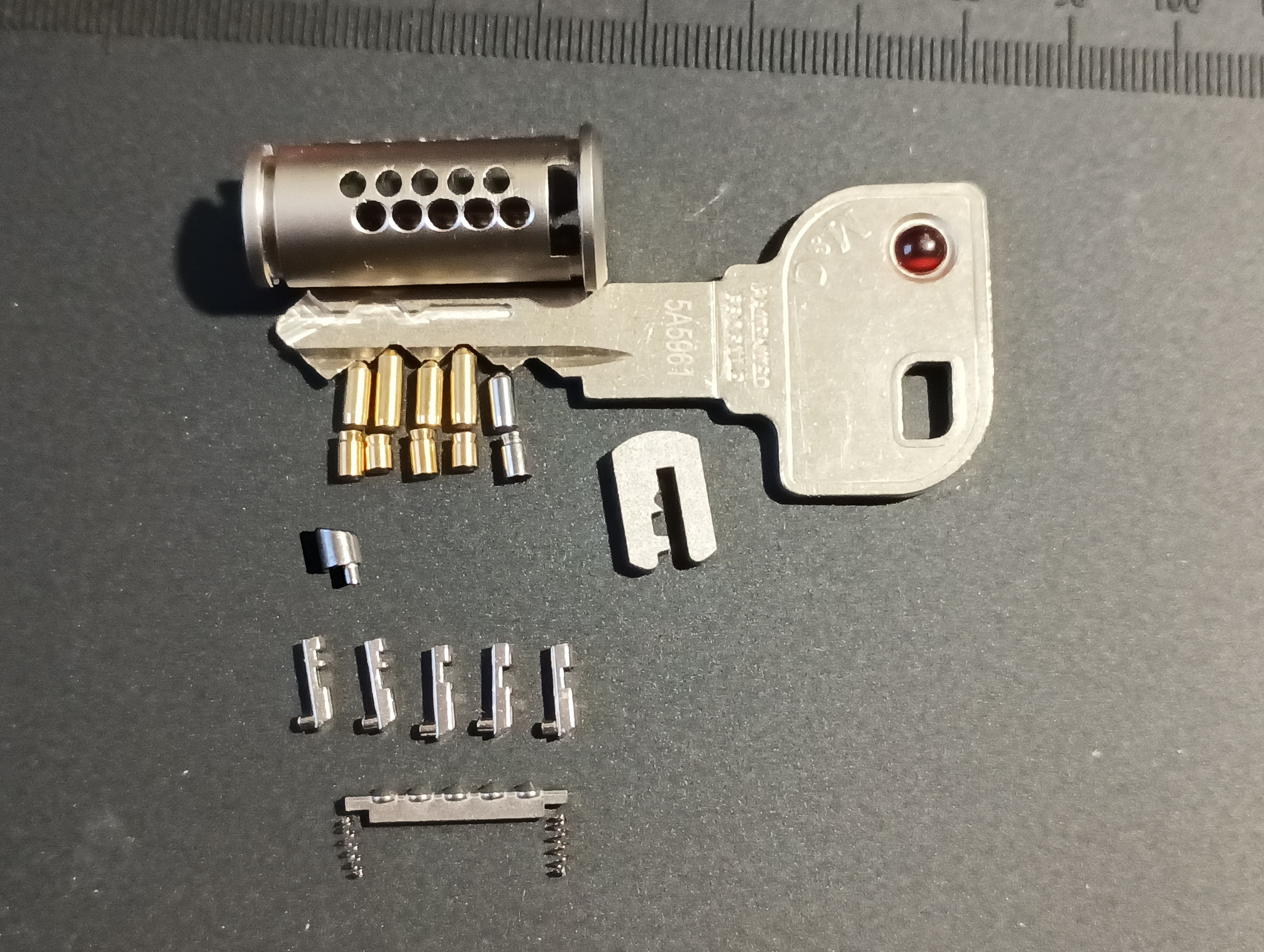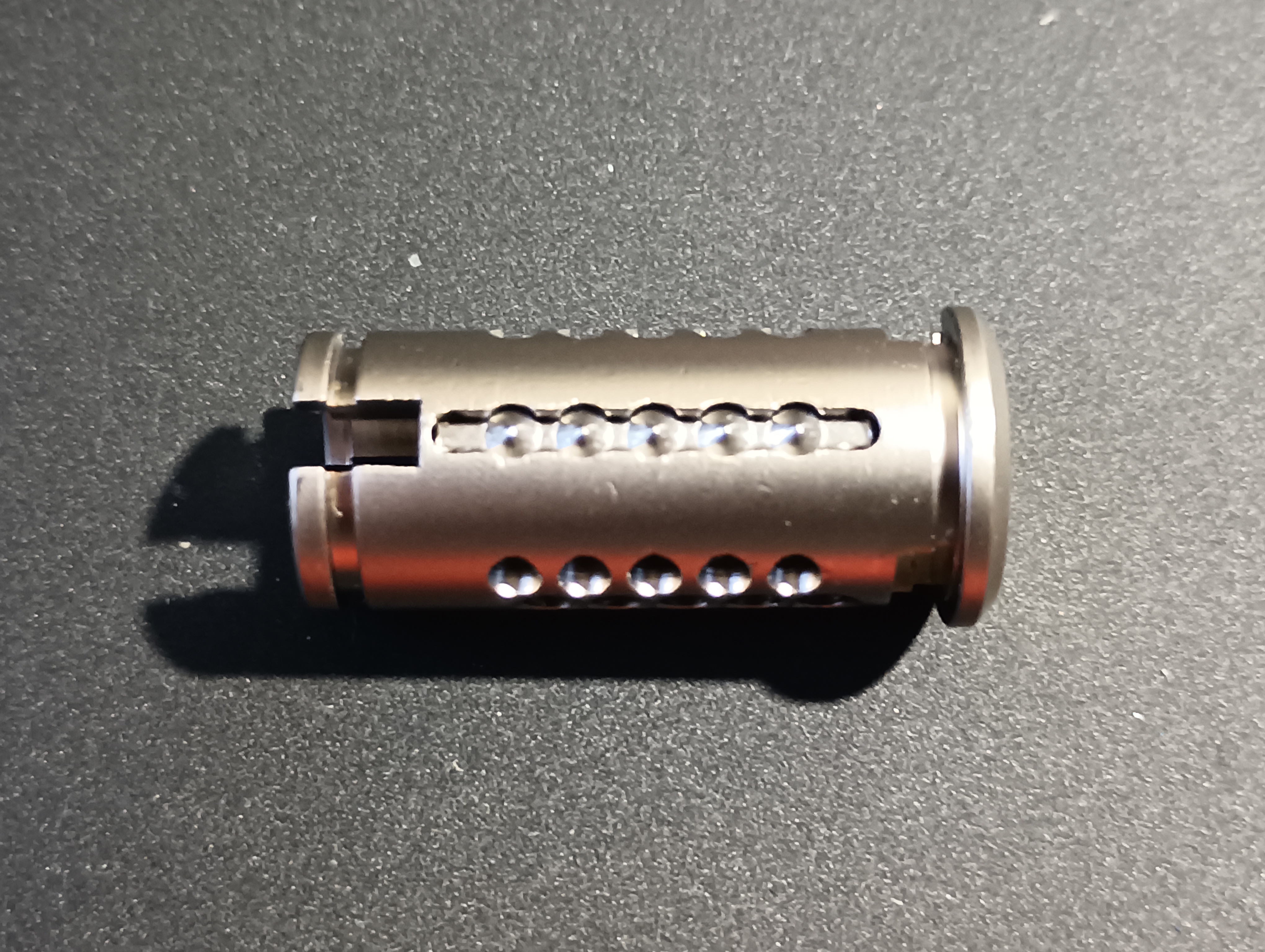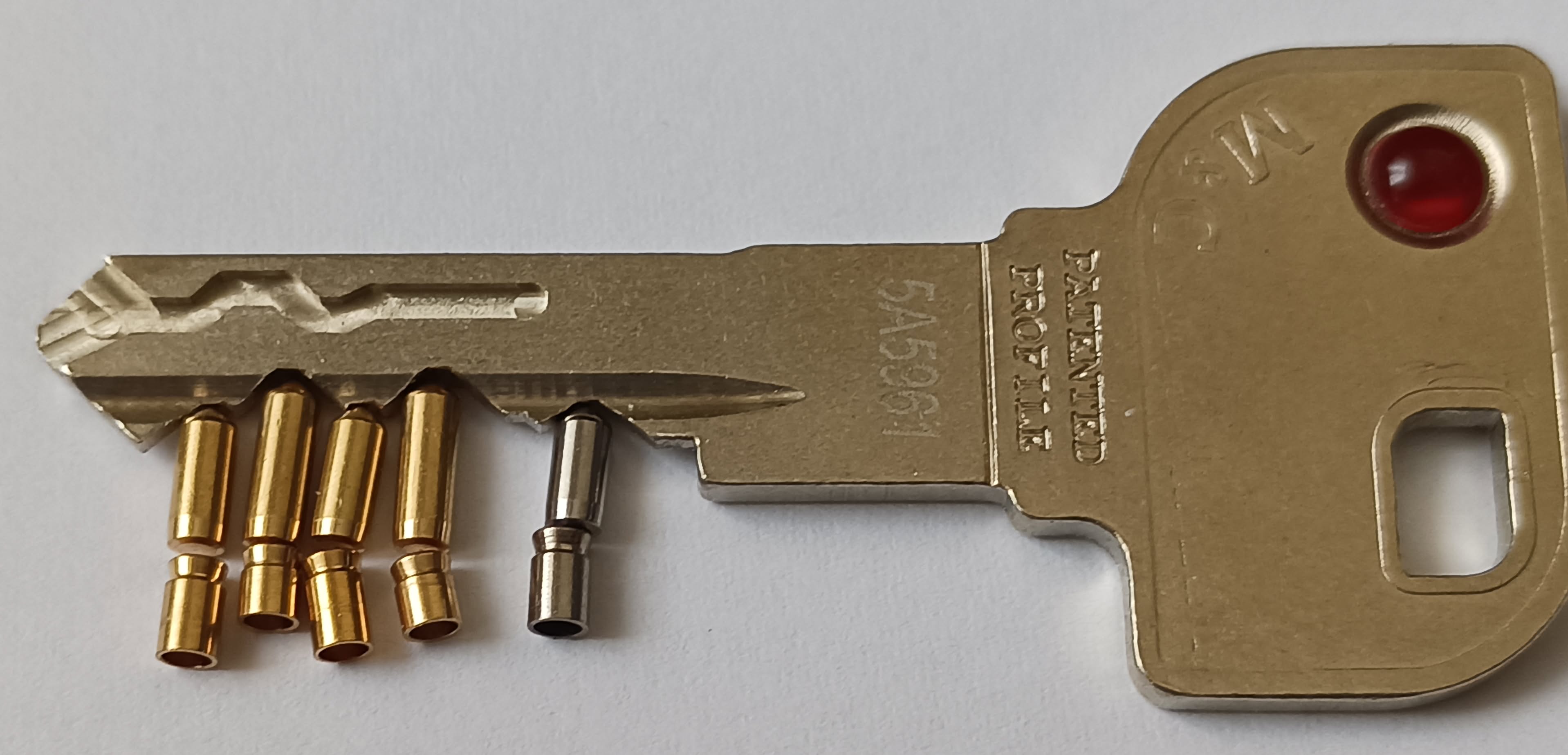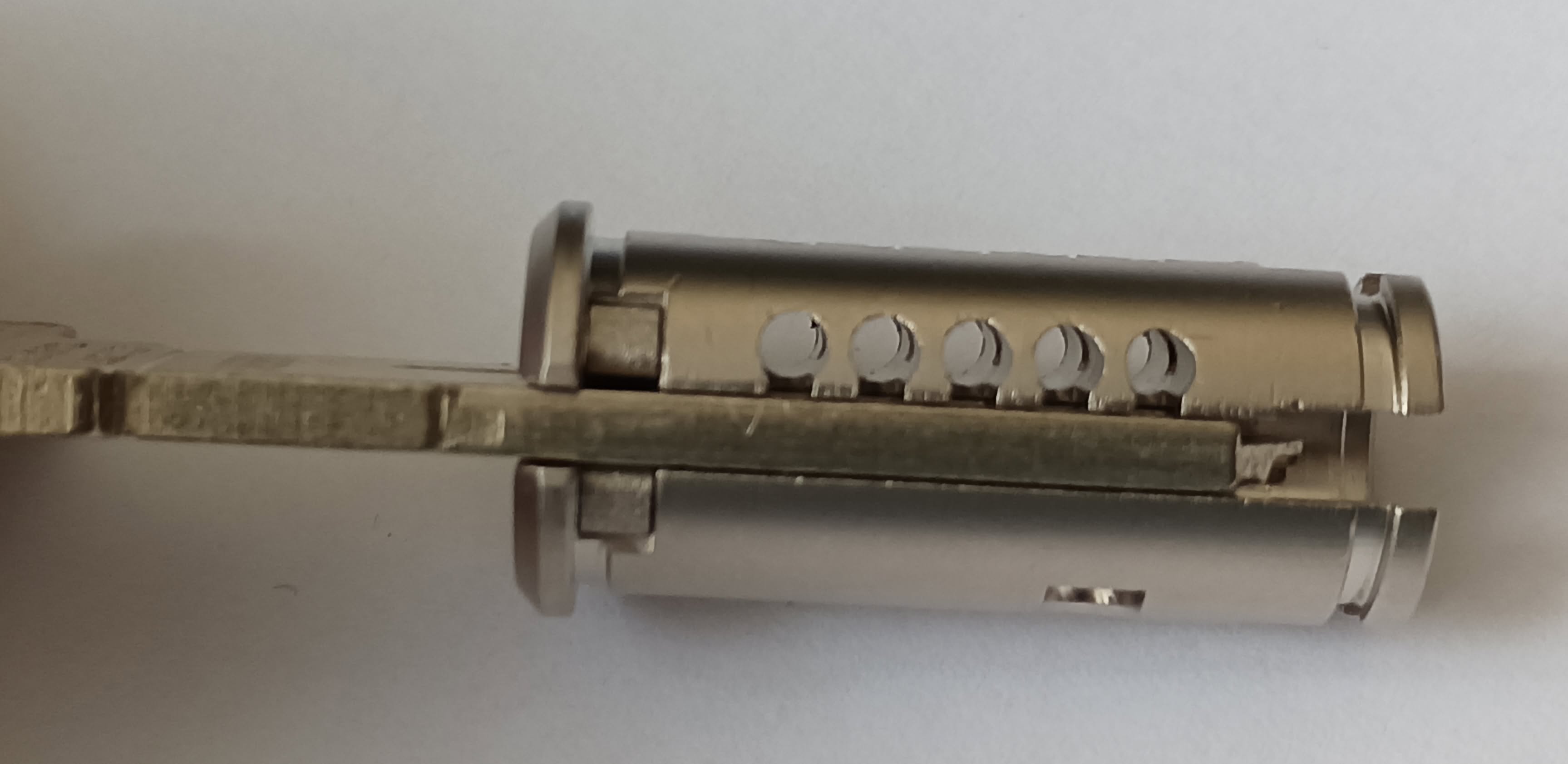 Первый пин и драйвер-пин сделаны из стали. Это усложняет высверливание плага и корпуса цилиндра — сталь более прочный материал, чем латунь.