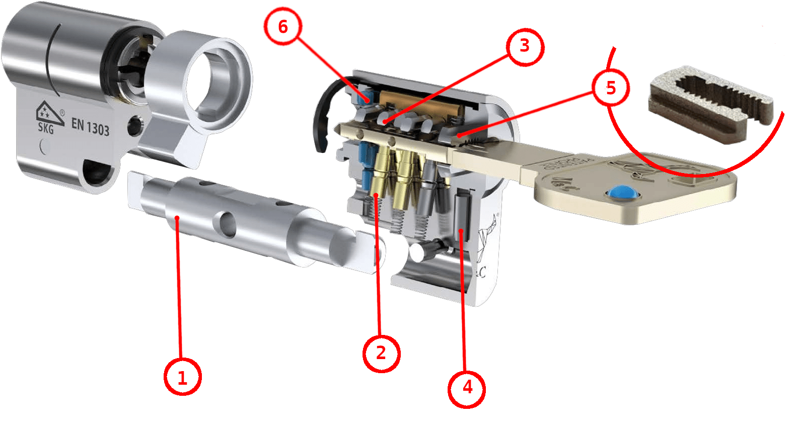 Механизм использует две кодовые системы: 6 классических подпружиненных пинов и 5 слайдеров (3)